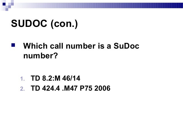 Sudoc. SUDOC (Catalogue collectif des bibliothèques et centres de documentation de. SuDoc call numbers are frequently given as part of bibliographic citations.